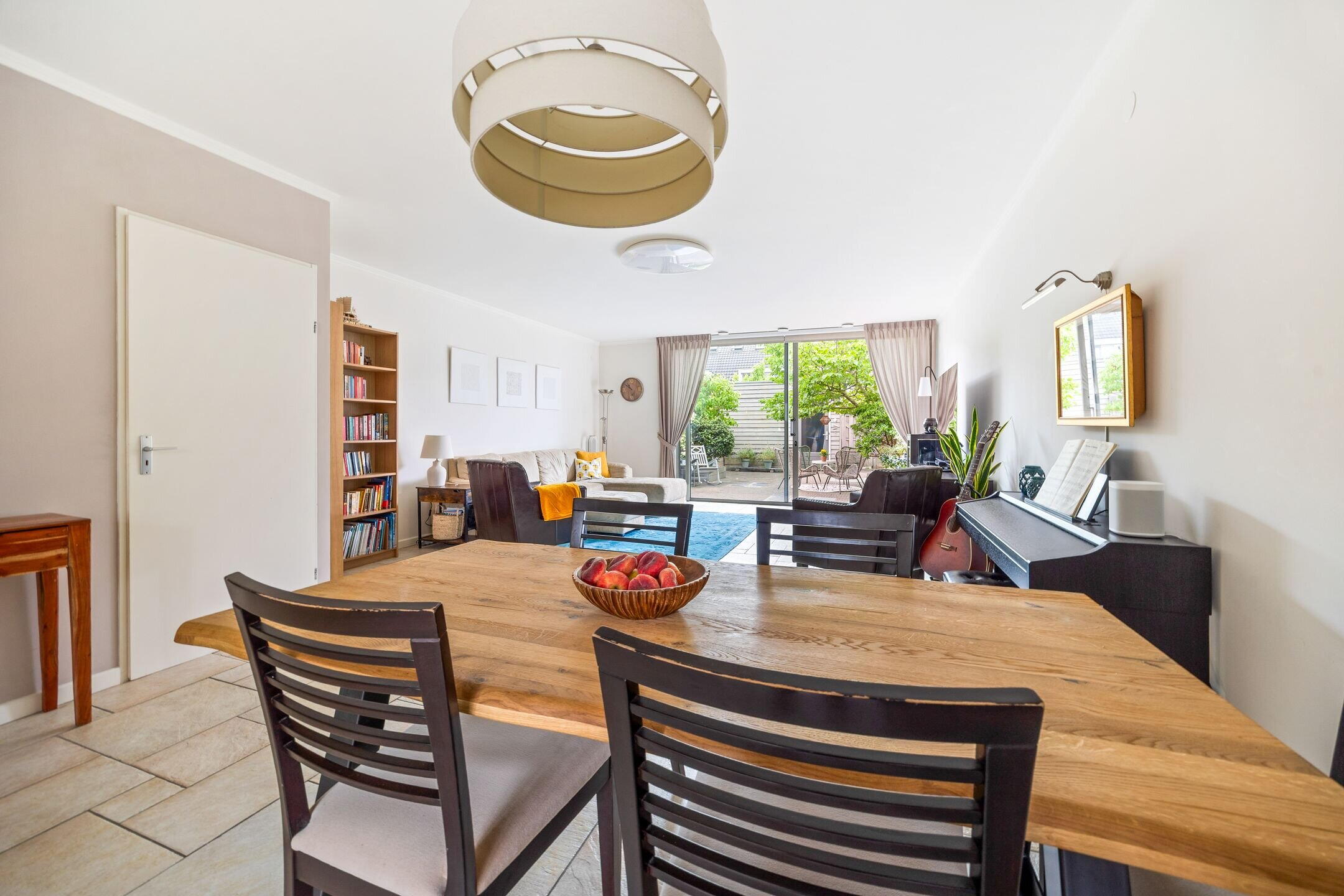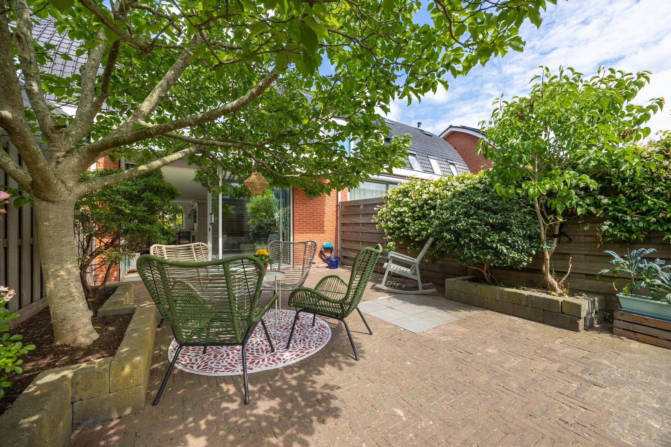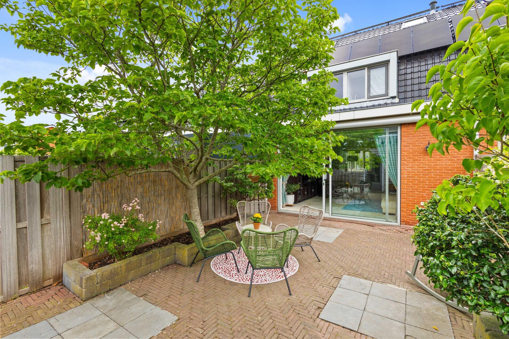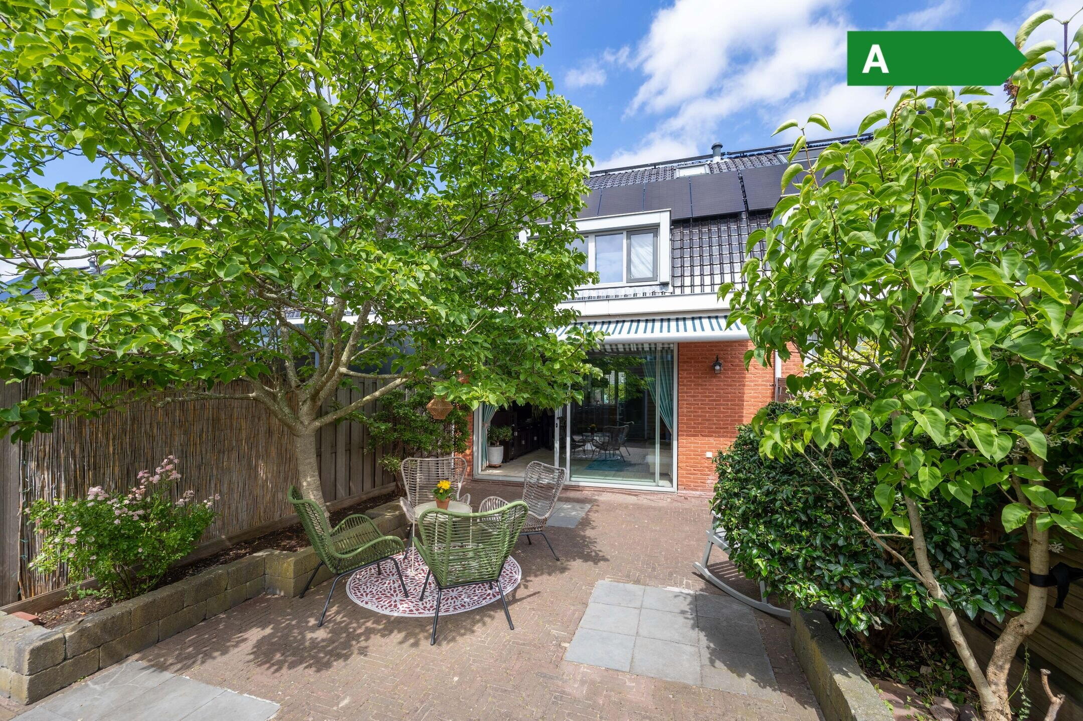 Vanuit het raam – net als de schuifpui voorzien van zonwering – kijkt u op en langs het prachtige lommerrijke boompje in de voortuin.