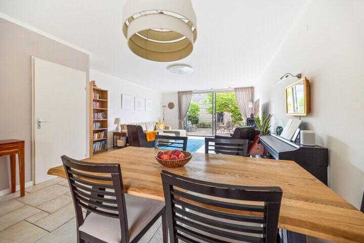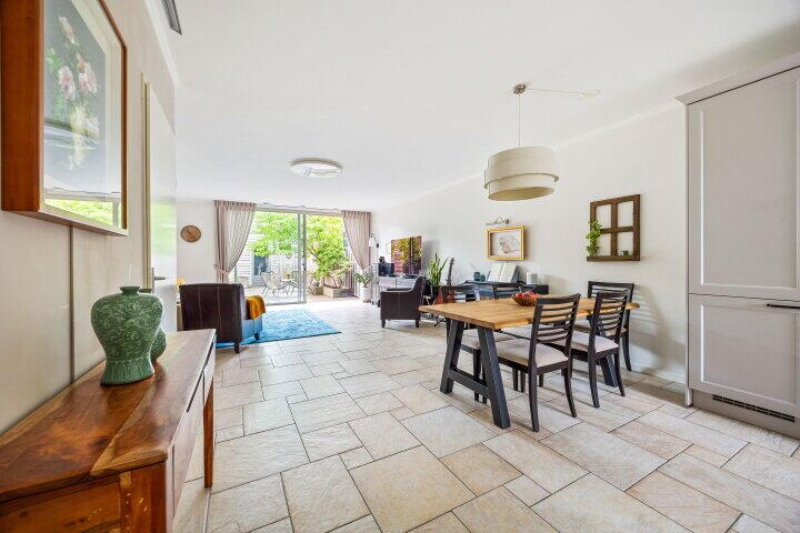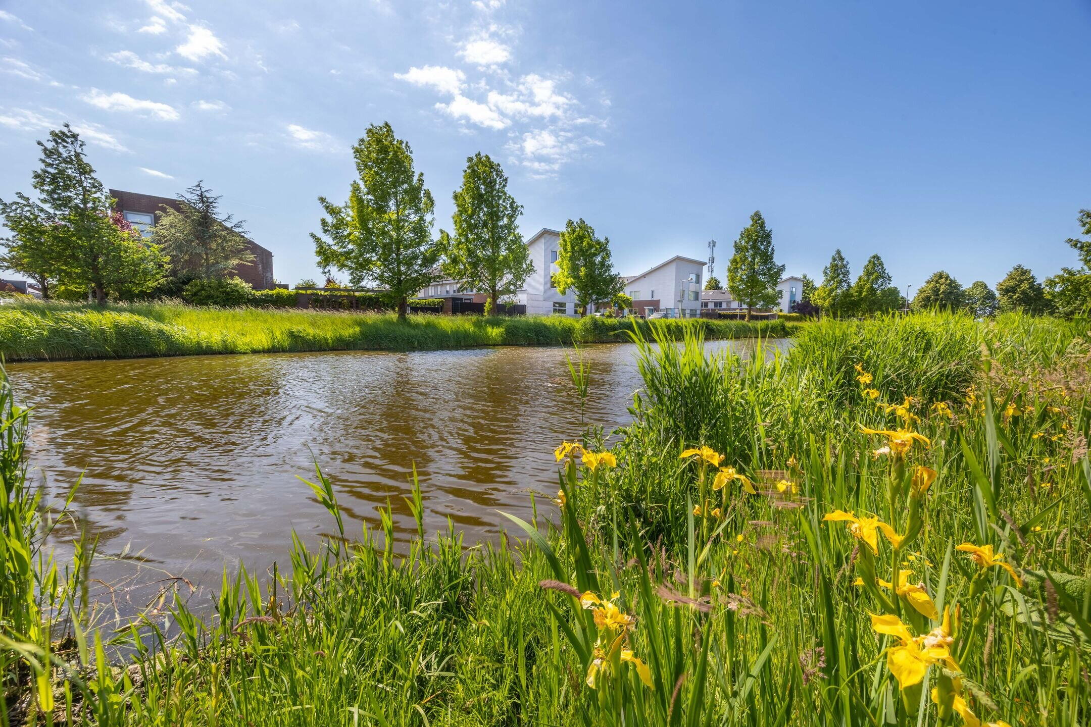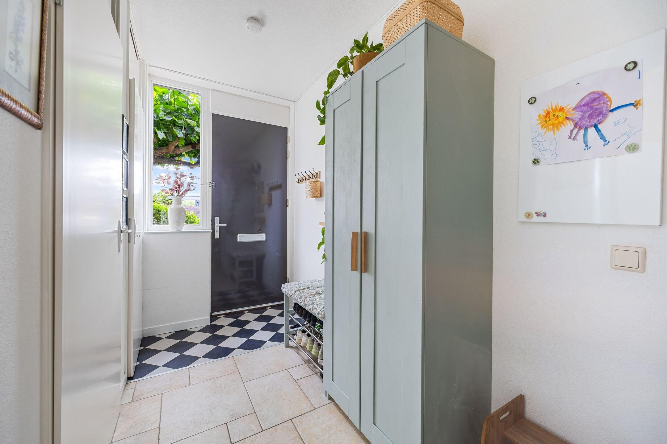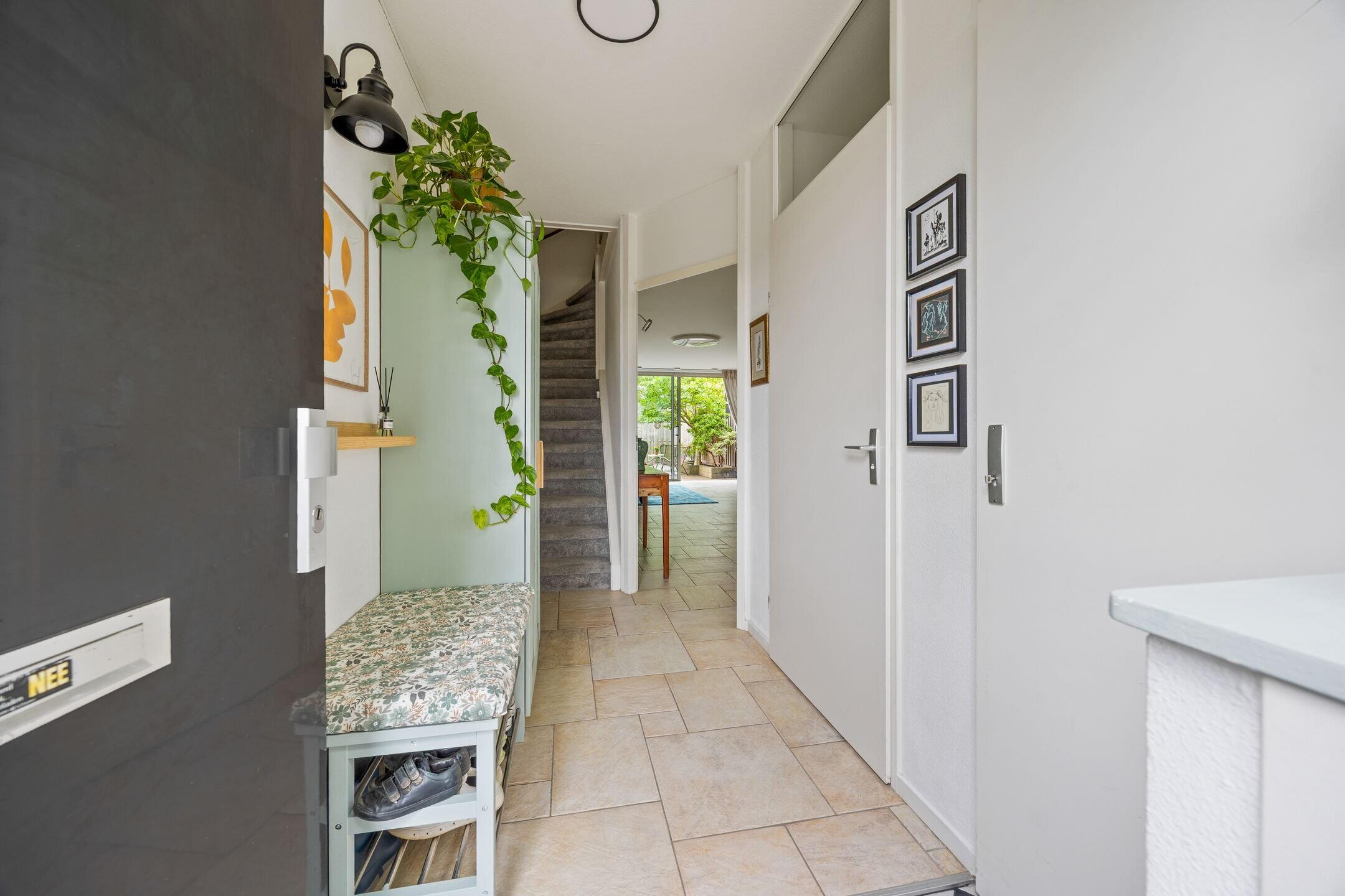 Vanuit het raam – net als de schuifpui voorzien van zonwering – kijkt u op en langs het prachtige lommerrijke boompje in de voortuin.