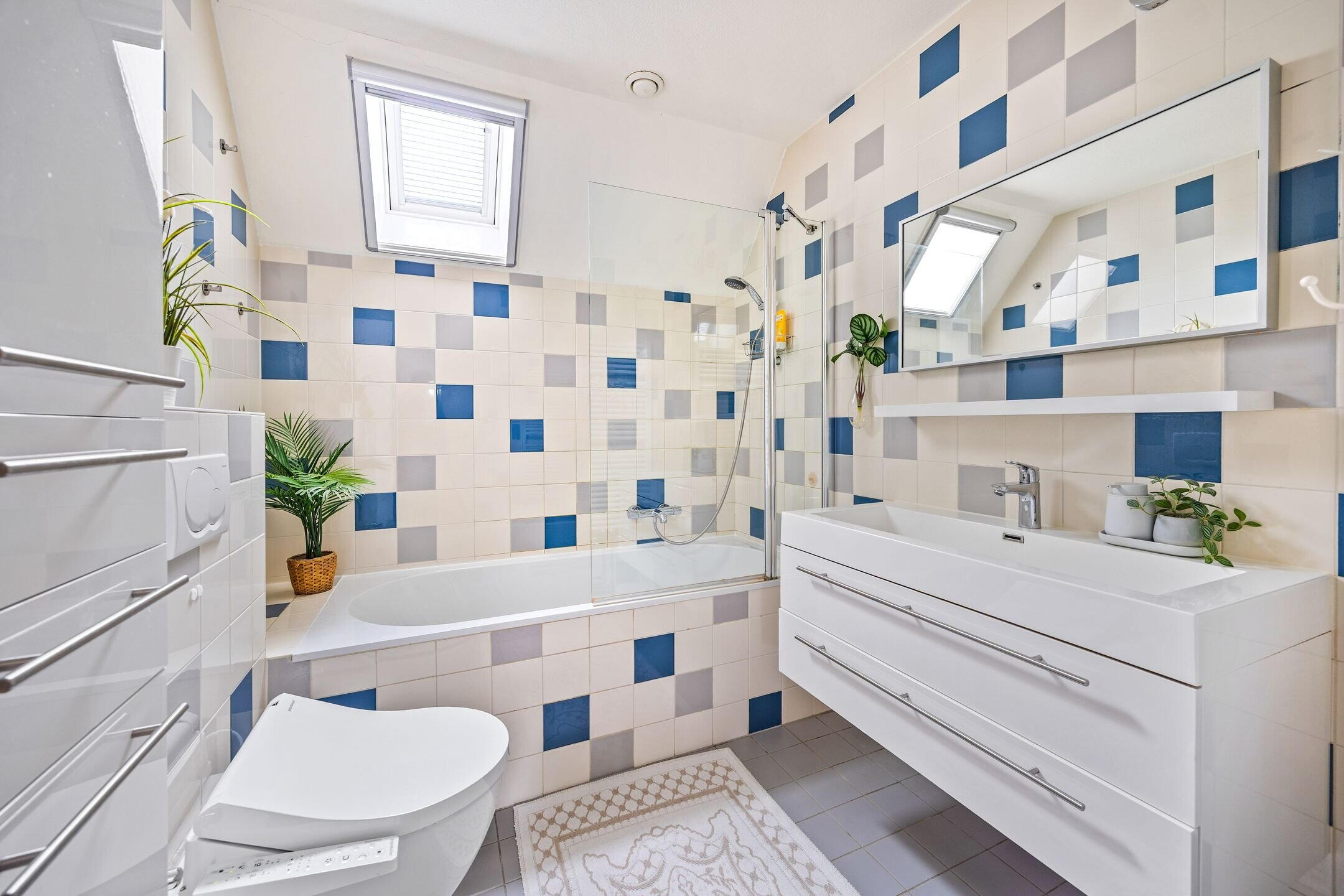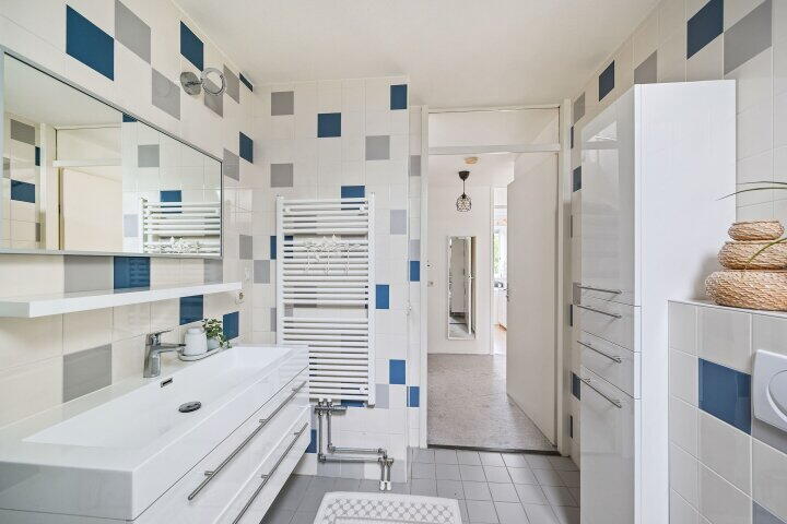 De badkamer is voorzien van een vrolijk kleurenpatroon en uitgerust met wastafelmeubel met dubbele wastafel, brede spiegelkast, zwevend tweede toilet, douche-/ligbadcombinatie, designradiator en een hoge handdoekenkast. Het raam is recent toegevoegd en zorgt voor extra daglicht en ventilatie.
