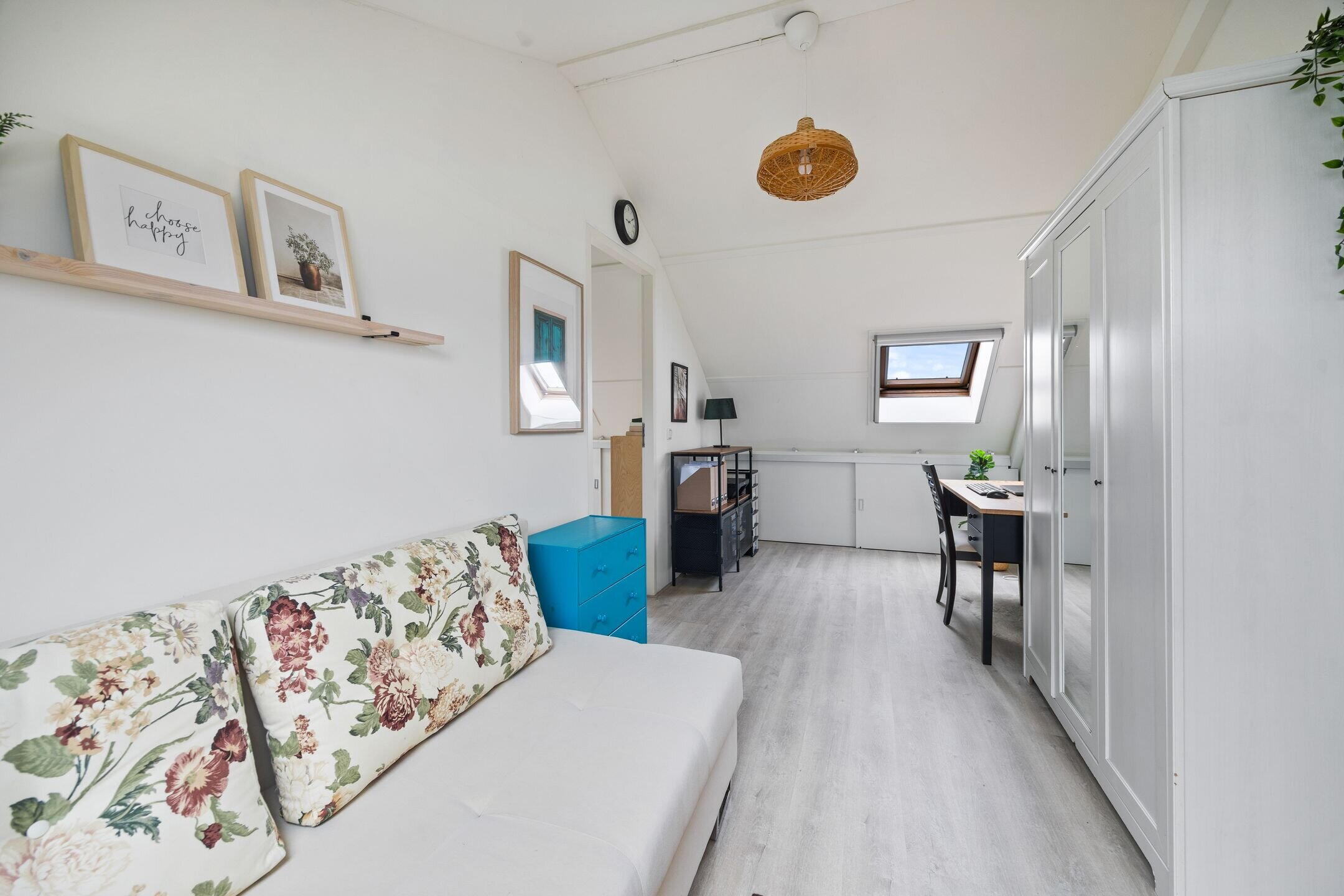 De ruime overloop heeft een zithoek en aan de andere kant een deur naar de ruimte met de witgoedopstelling, cv-ketel, WtW-unit en de omvormer voor uw zonnepanelen (11 stuks).