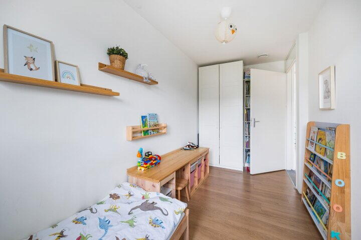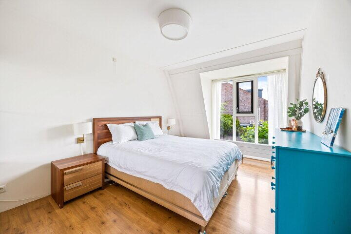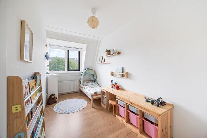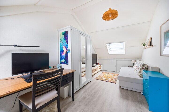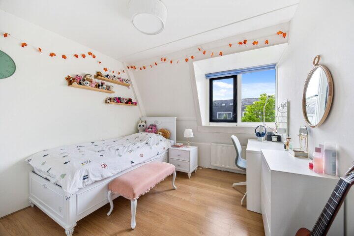 De volgende trap brengt u naar de tweede verdieping waar u de vierde slaapkamer van deze woning aantreft, die profiteert van de gehele lengte van de woning. Een heerlijke ruimte die zich heel goed leent voor het combineren van slapen en studeren of relaxen. Eventueel kunt u de ruimte splitsen en een extra slaapkamer creëren. Beide kanten van de ruimte hebben Velux-ramen (inclusief zonwering) met daaronder extra bergruimte.