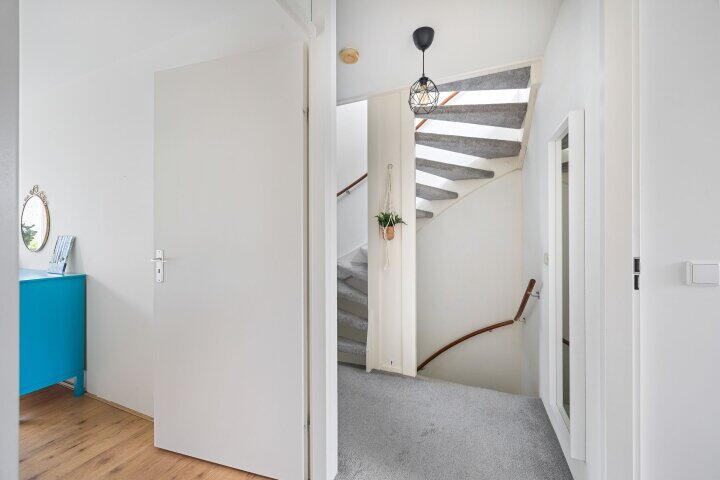 Op beide verdiepingsvloeren ligt houtlook laminaat; de overloop van de eerste verdieping is bekleed met tapijt, net als beide trappen.