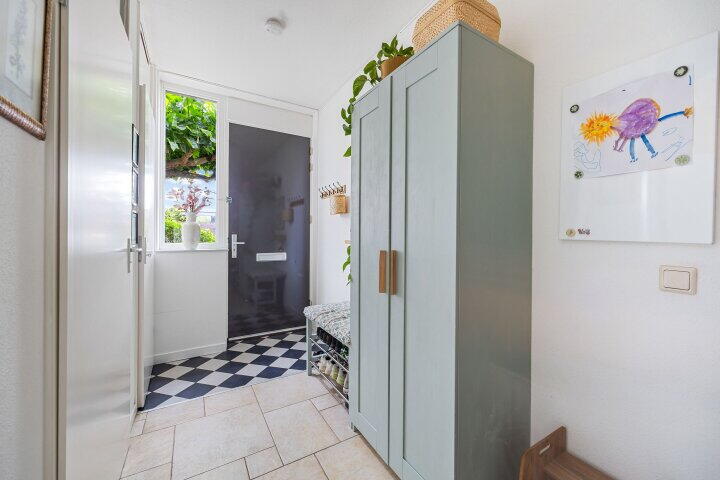 U komt binnen in de lichte hal, op een vloer met gemêleerde plavuizen. Die loopt door over de hele begane grond en is voorzien van comfortabele vloerverwarming. Als u de deur naar de woonkamer opent, valt meteen op hoe verrassend ruim deze is; het luxe effect van een uitbouw. De grote schuifpui zorgt voor veel lichtinval en een natuurlijke verbinding met de buitenruimte.